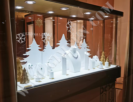 櫥窗設計以冬季主題為背景,面向顧客展示各種精美的珠寶首飾。陳列架上布置有不同高度的展示臺,用于突出展示項鏈、耳環(huán)等產(chǎn)品,同時還點綴有雪花和圣誕樹等裝飾,營造溫馨且富有節(jié)日氣氛的氛圍。店內照明柔和,整體布局優(yōu)雅,吸引著路過的顧客駐足欣賞。