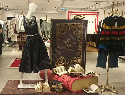 通過精巧的造型設(shè)計與精準(zhǔn)的比例掌控,這一系列書本與道具巧妙地還原了經(jīng)典文學(xué)的浪漫氛圍。巨型書籍與翻開的紙頁層疊擺放,營造出濃厚的藝術(shù)書卷氣息,讓整個櫥窗仿佛化身為《仲夏夜之夢》的舞臺。每一本書的質(zhì)感與細節(jié)都經(jīng)過精心處理,不僅提升了空間的故事感,也賦予展示作品獨特的文化深度與視覺層次,使觀者沉浸于文學(xué)與時尚交織的夢幻世界之中。