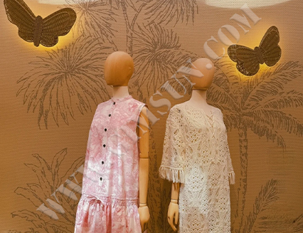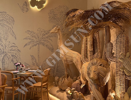 浮雕墻面與藤編動(dòng)物巧妙結(jié)合,營造出獨(dú)特的熱帶沙漠氛圍。墻上的蝴蝶燈飾更添靈動(dòng)與活力,為顧客提供獨(dú)特而舒適的購物體驗(yàn),仿佛身臨異域風(fēng)光。