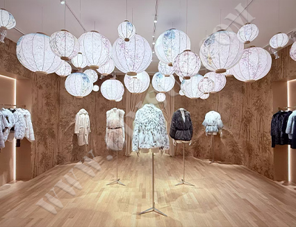 採用經(jīng)典的和紙作為展示道具和牆面裝飾,呈現(xiàn)出獨特的自然紋理和高雅的藝術(shù)質(zhì)感。和紙不但具備優(yōu)良的透光性,使燈光柔和散射,還具有優(yōu)異的隔熱性能,調(diào)節(jié)室內(nèi)溫度。其天然植物纖維材料無化學(xué)添加,符合現(xiàn)代可持續(xù)設(shè)計趨勢,體現(xiàn)對環(huán)保的承諾與責(zé)任。如此精緻的設(shè)計,不僅提升了品牌的文化深度和歷史感,更契合其追求的簡約與侘寂美學(xué),令顧客置身於充滿格調(diào)的購物環(huán)境。