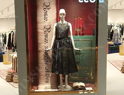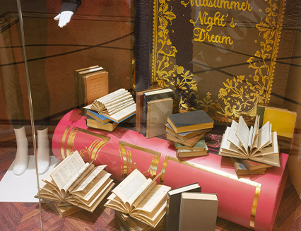 Through exquisite modeling design and precise control of proportions, this series of books and display props skillfully recreates the romantic ambiance of classic literature. The layered arrangement of gigantic books and open pages fosters a strong artistic and scholarly aura, transforming the entire window display into a stage reminiscent of "A Midsummer Night's Dream." The texture and details of each book are meticulously crafted, not only enhancing the spatial narrative but also endowing the display with unique cultural depth and visual layers, immersing viewers in a dreamworld where literature and fashion intertwine.